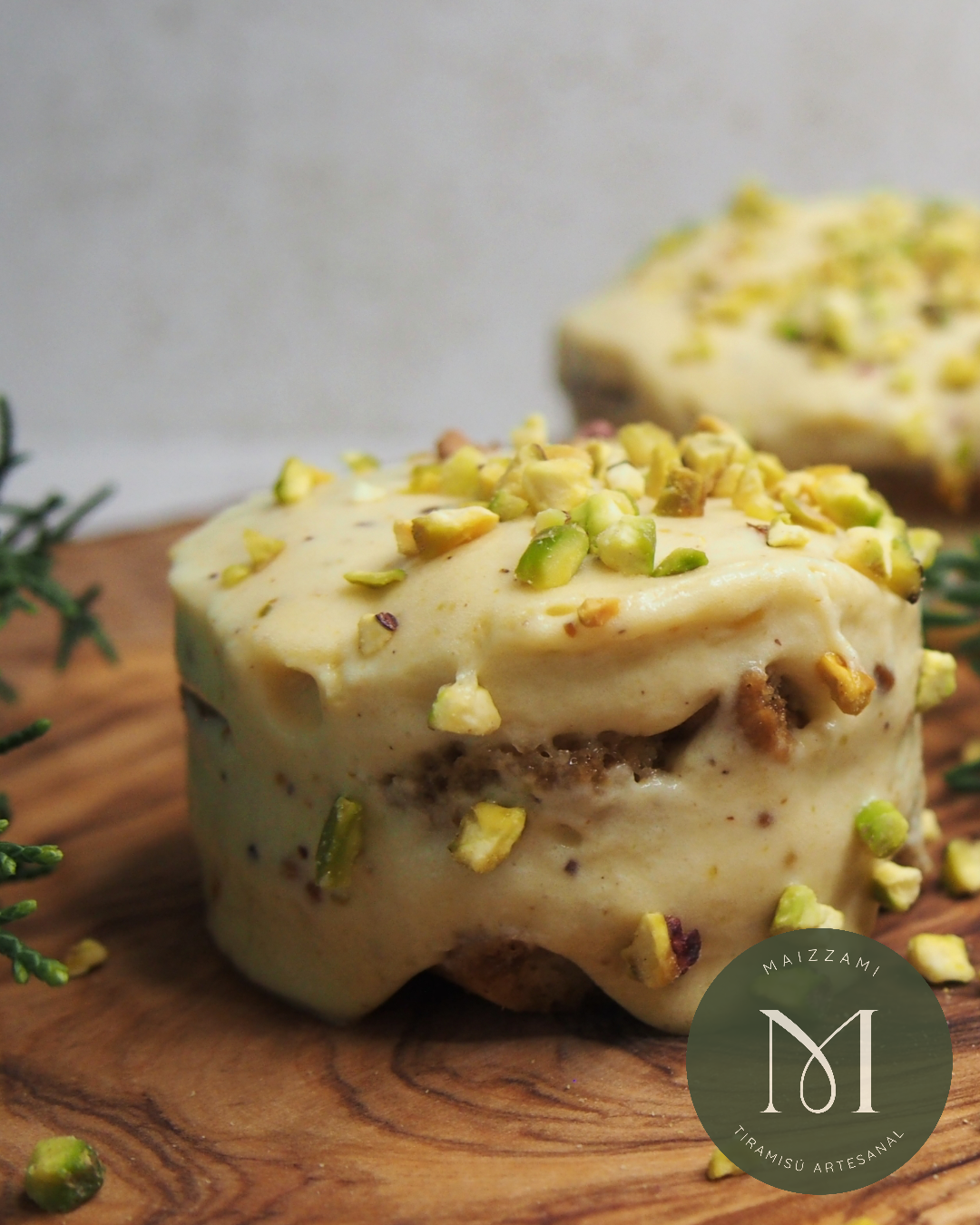 Queso mascarpone, pistacho 100% ibérico, huevo pasteurizado, azúcar, café descafeinado y pistacho.